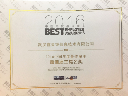 2017年1月,由北京大學社會調查研究中心和智聯招聘聯合發起的“2016中國年度最佳雇主”活動評選近日揭曉:武漢鑫靈銳從萬余家參評企業中脫穎而出,榮獲“2016年度中國最佳雇主”提名獎。